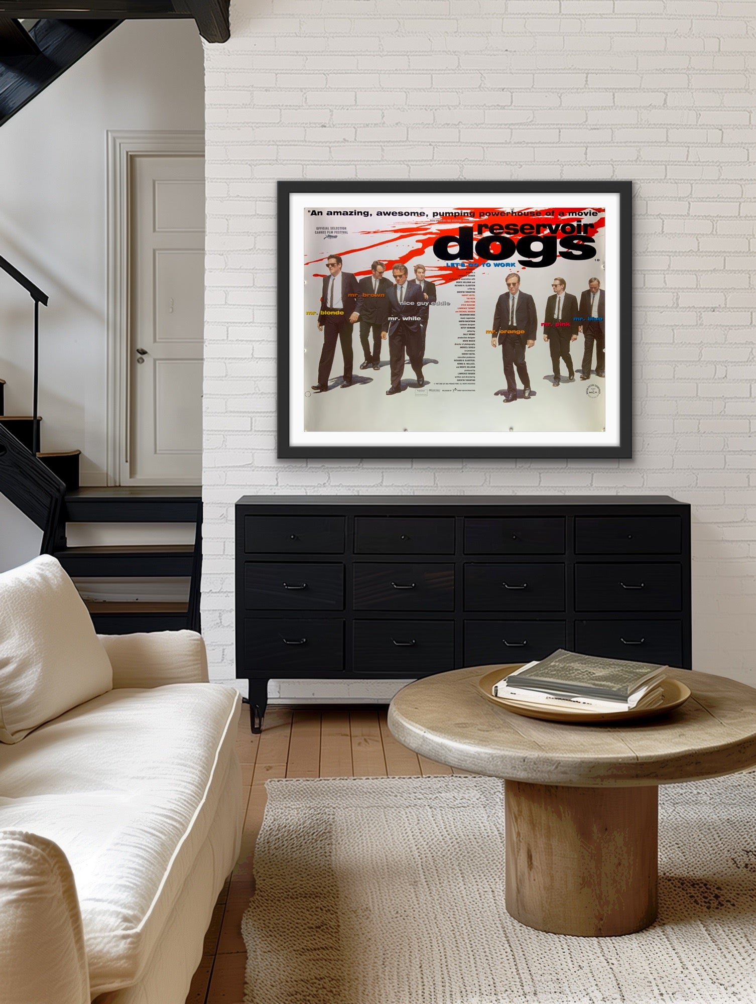 A guaranteed original UK quad movie poster from 1992 for Quentin Tarantino's fantastic heist-gone-wrong thriller "Reservoir Dogs", starring Harvey Keitel, Tim Roth, Chris Penn, Steve Buscemi, Lawrence Tierney, Michael Madsen, Edward Bunker and Tarantino himself.