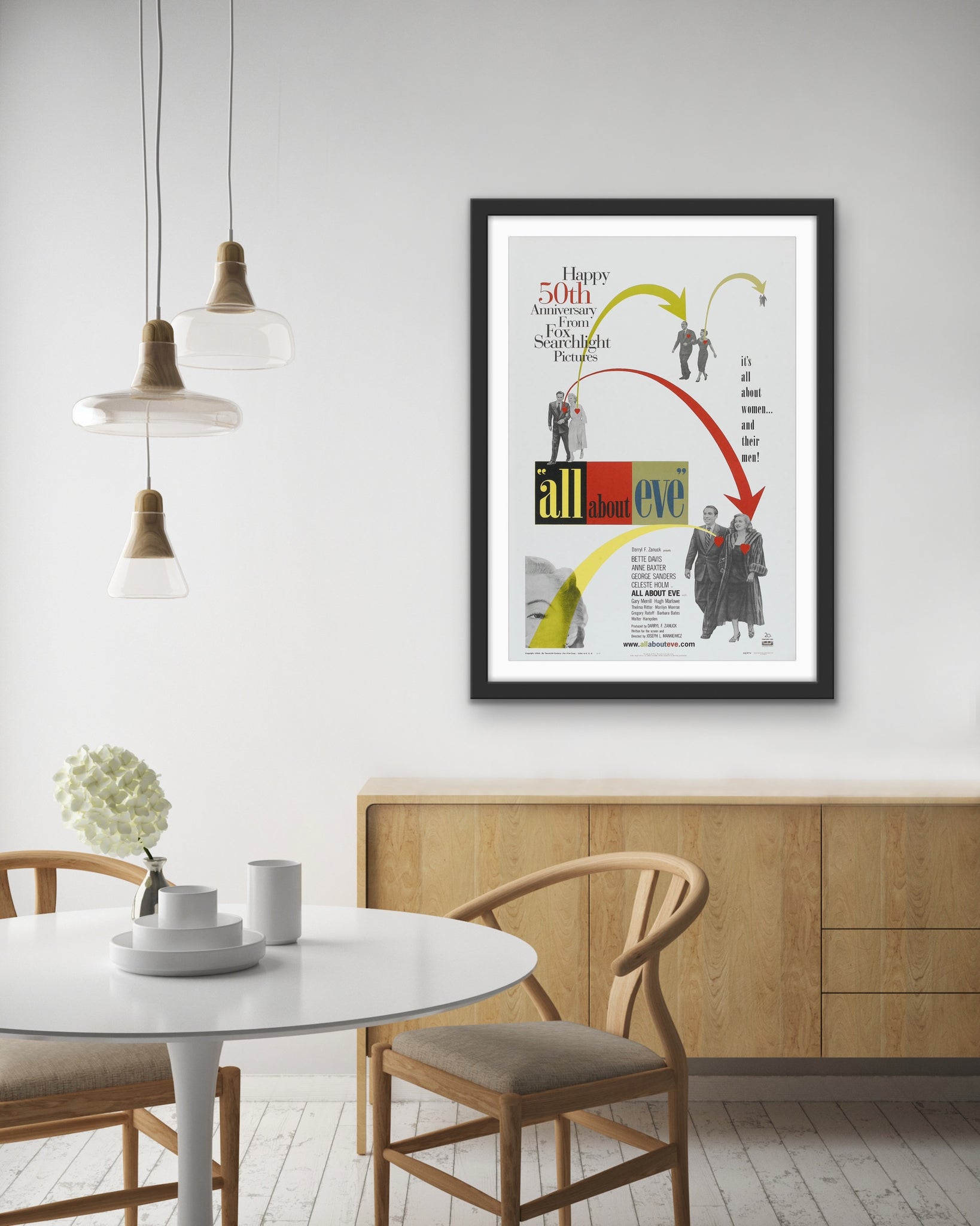 A guaranteed original one sheet movie poster from the fiftieth anniversary release of Joseph L. Mankiewicz's 1950 romantic drama "All About Eve", starring Bette Davis, Anne Baxter, George Sanders, Celeste Holm, Gary Merrill, Hugh Marlowe, Thelma Ritter, Marilyn Monroe, Gregory Ratoff, Barbara Bates and Walter Hampton.