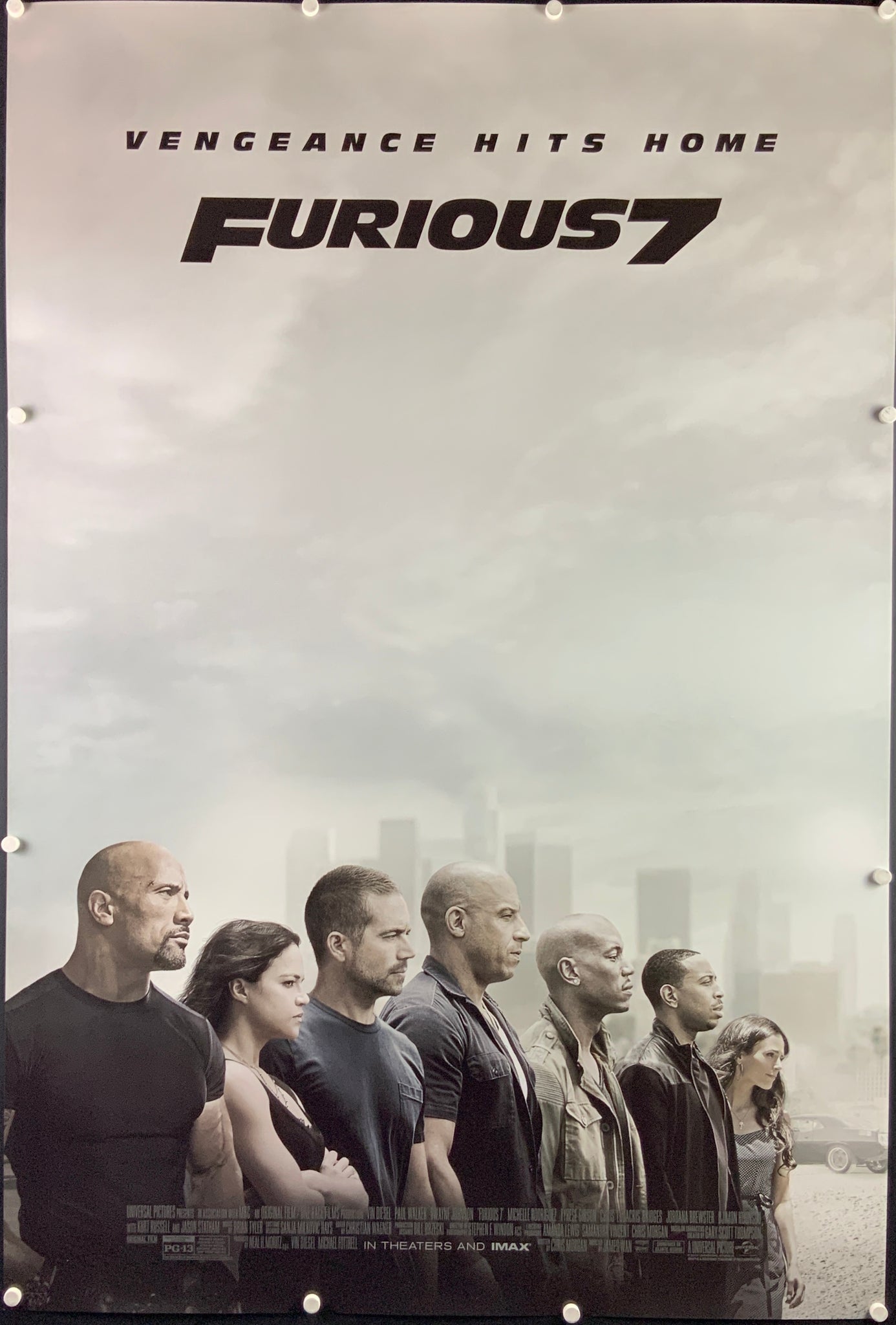 A guaranteed original one sheet movie poster from 2015 for James Wan's car racing crime thriller sequel "Furious 7", also released as "Fast and Furious 7", starring Jason Statham, Dwayne Johnson, Vin Diesel, Ronda Rousey and Paul Walker.