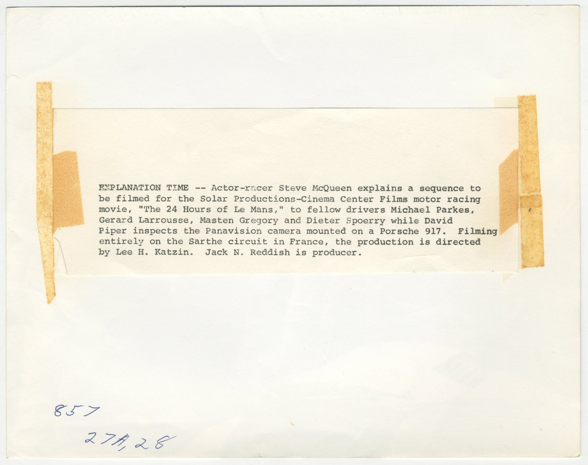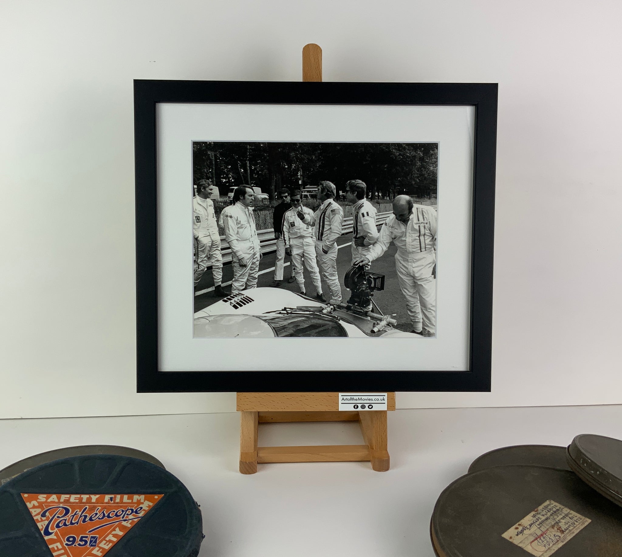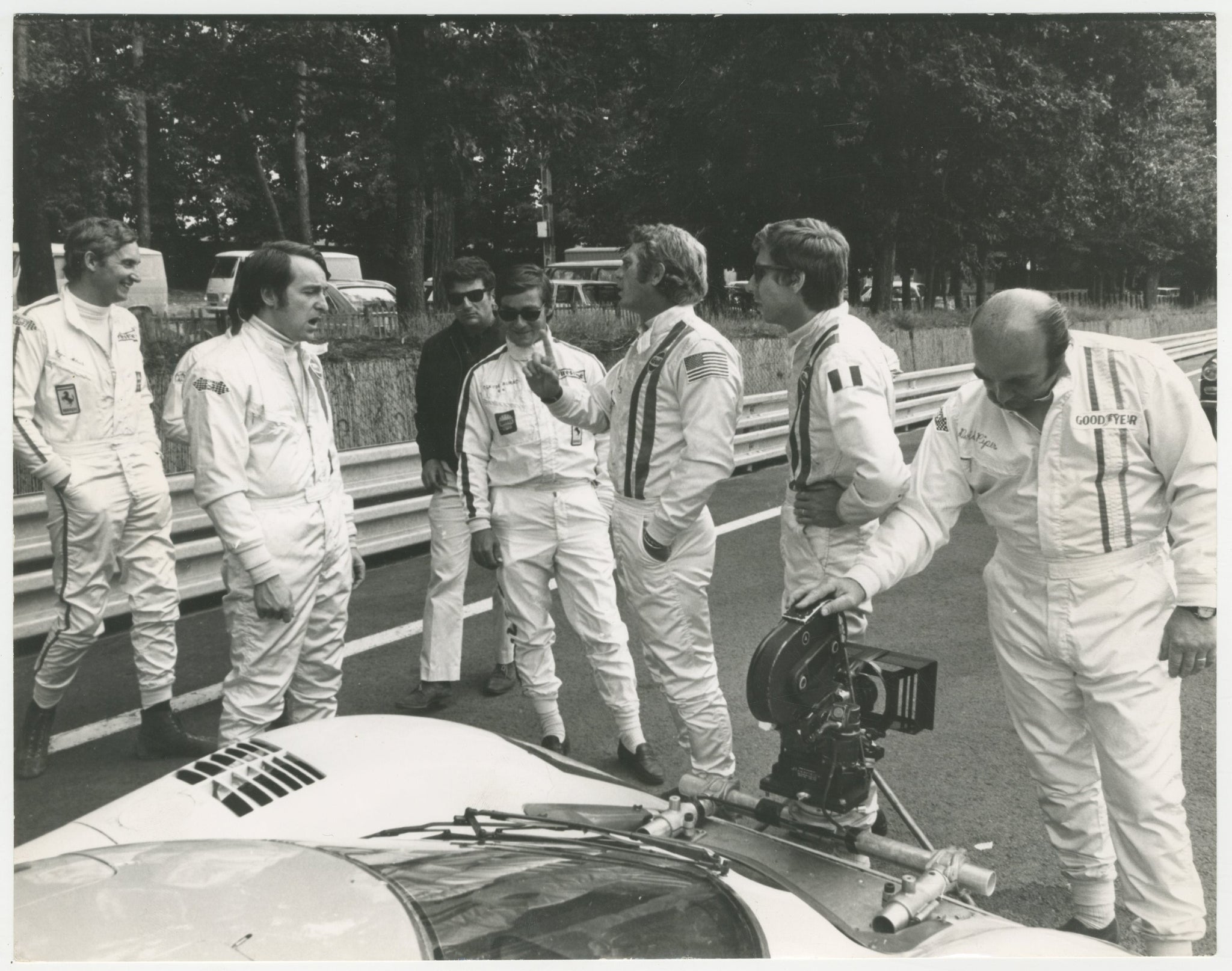 This superb candid movie still, showing McQueen explaining a scene to racing drivers Michael Parkes, Gerard Larrousse, Masten Gregory and Dieter Spoerry, would have been snapped by a Unit Still Photographer during production and then used for promotion during the film's release.