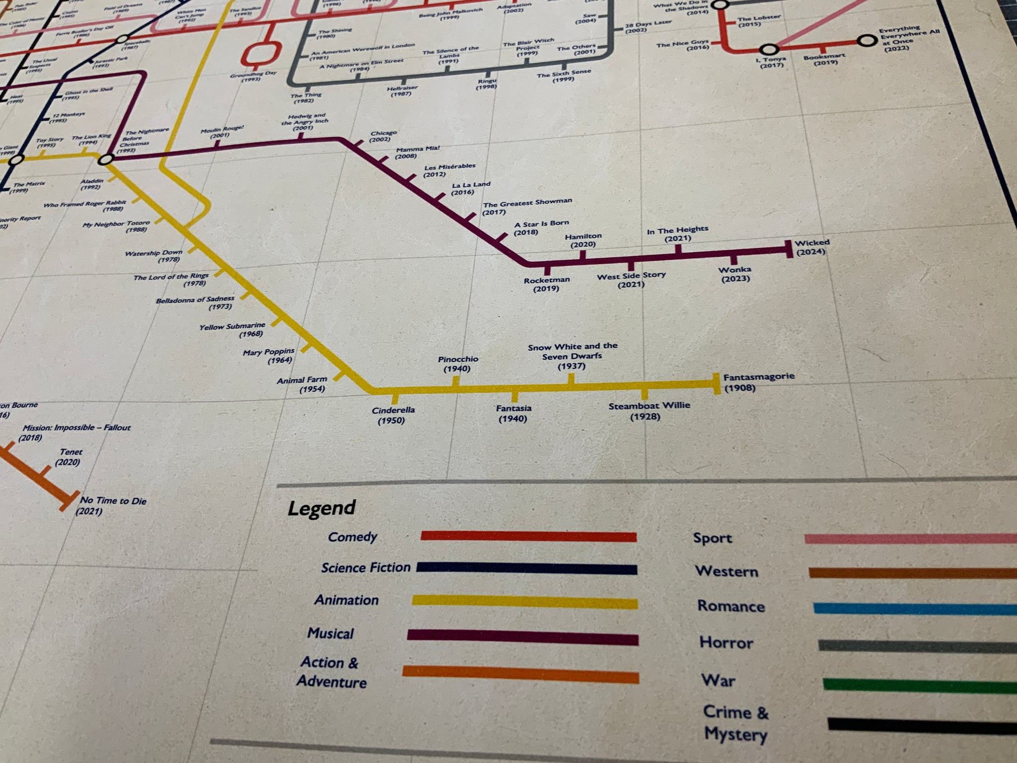 Each line is painstakingly mapped to provide a chronological history of a major film genre, with over 400 movies from the earliest years of cinema, to the present day.
