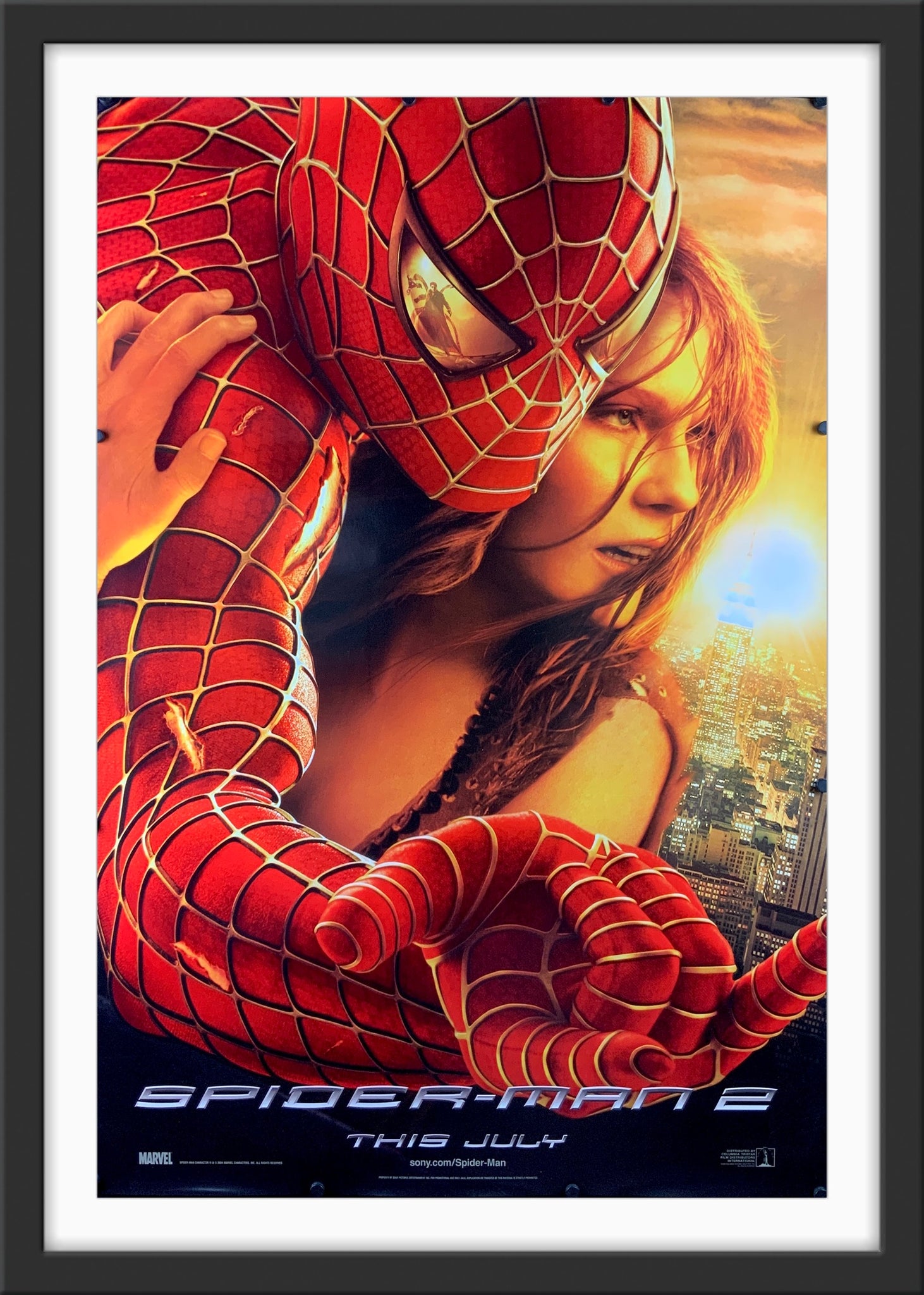 A guaranteed original one sheet advance movie poster from 2004 for Sam Raimi's super hero sequel "Spider-Man 2", based on the Marvel comics created by Stan Lee and Steve Ditko.