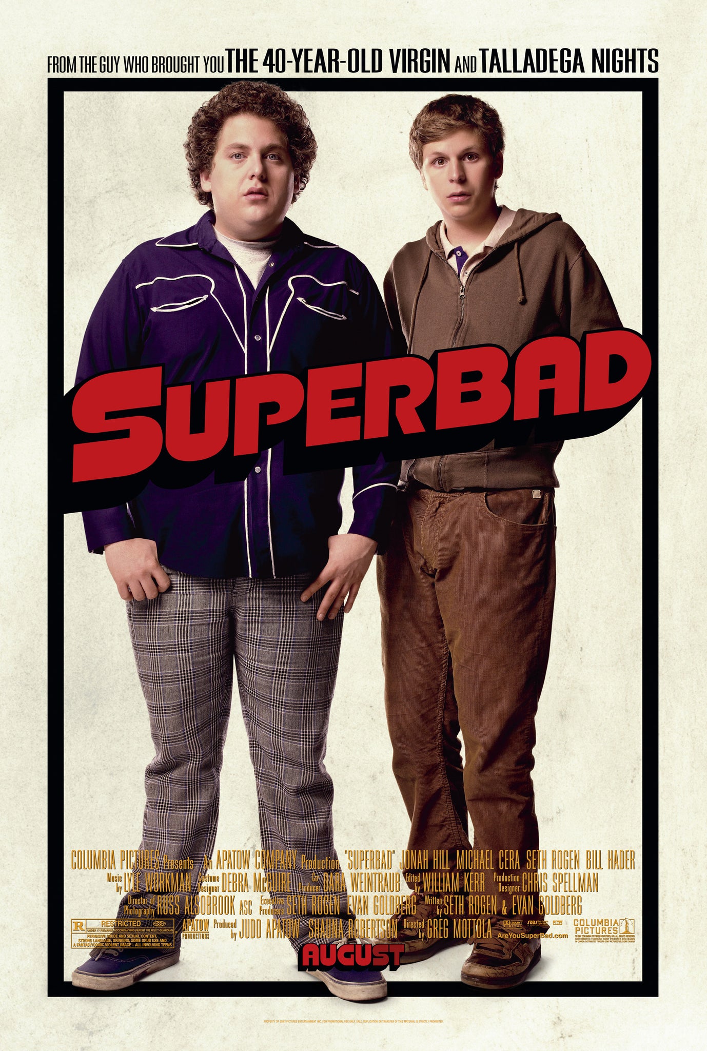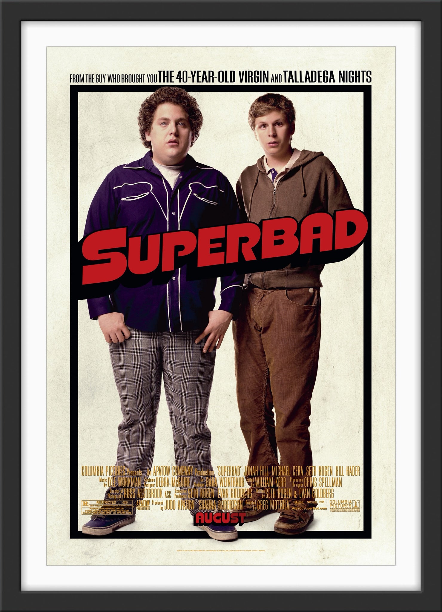 A guaranteed original one sheet movie poster from 2007 for Greg Mottola's coming-of-age teen buddy comedy "Superbad", starring Jonah Hill, Michael Cera, Christopher Mintz-Plasse, Bill Hader and Seth Rogen.