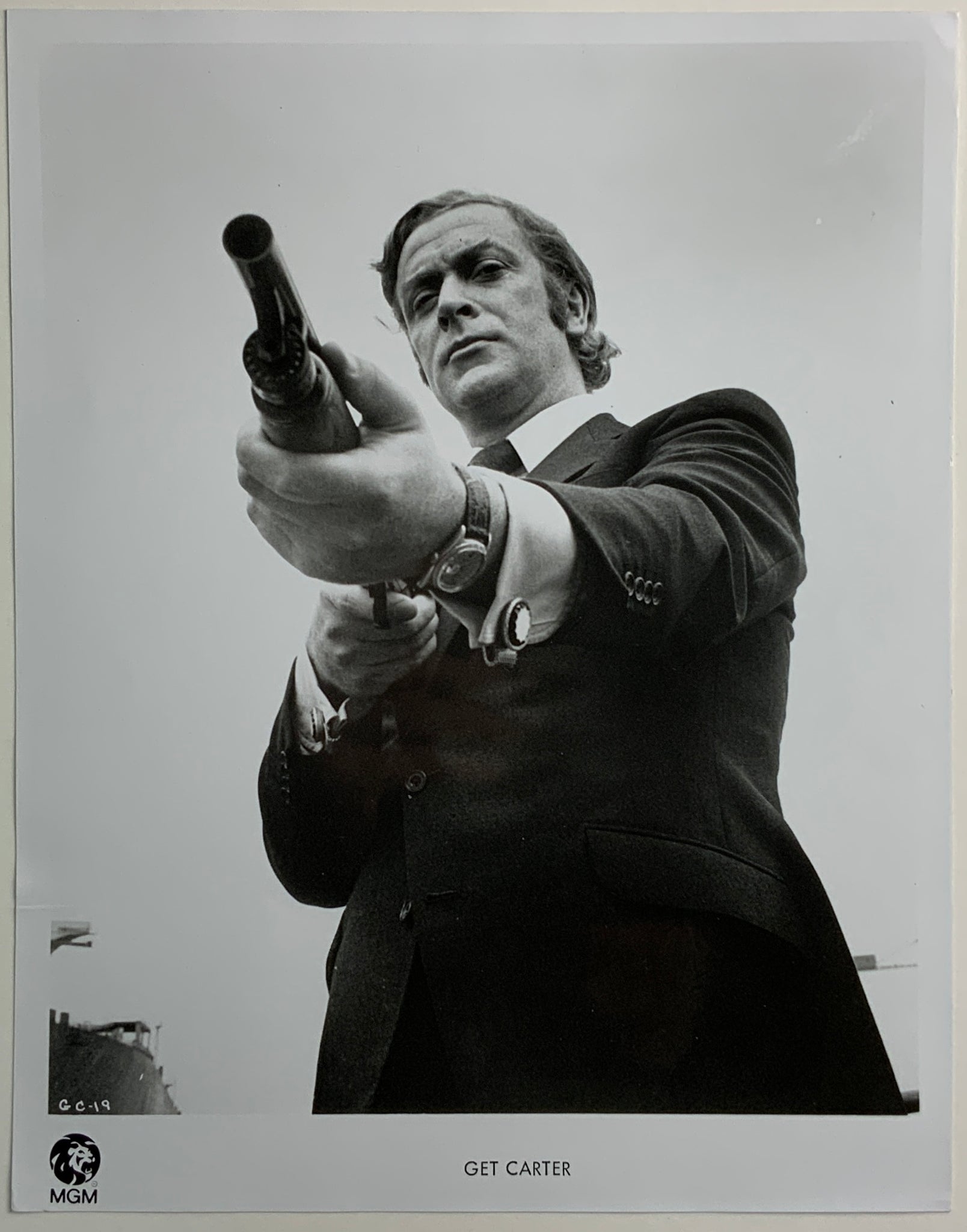 This superb movie still, with an iconic image of Caine's gun touting Carter, was taken by a Unit Still Photographer during filming and then used for publicity during the film's release.