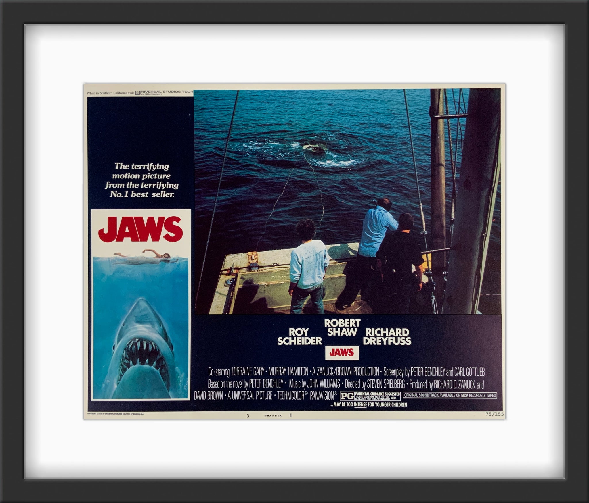 A guaranteed original and framed '11x14' lobby card from the original 1975 release of Steven Spielberg's masterpiece "Jaws", starring Roy Scheider, Robert Shaw, Richard Dreyfuss and Lorraine Gary.