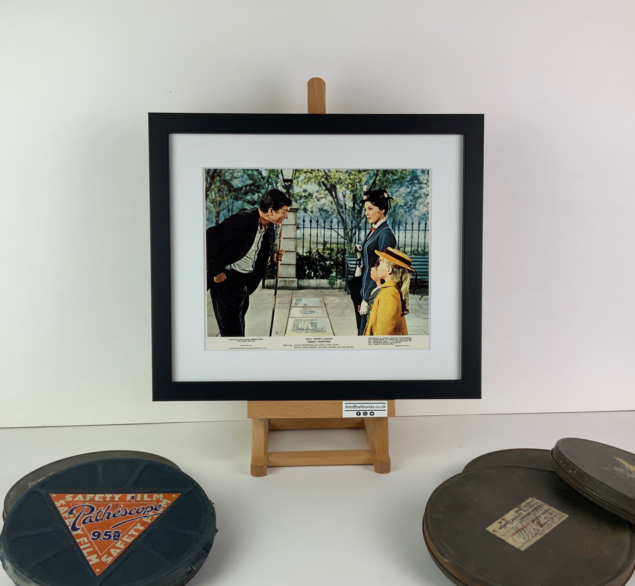 A guaranteed original and framed '8x10' lobby card from 1973 for Robert Stevenson's 1964 fantasy musical "Mary Poppins", starring Julie Andrews and Dick Van Dyke.