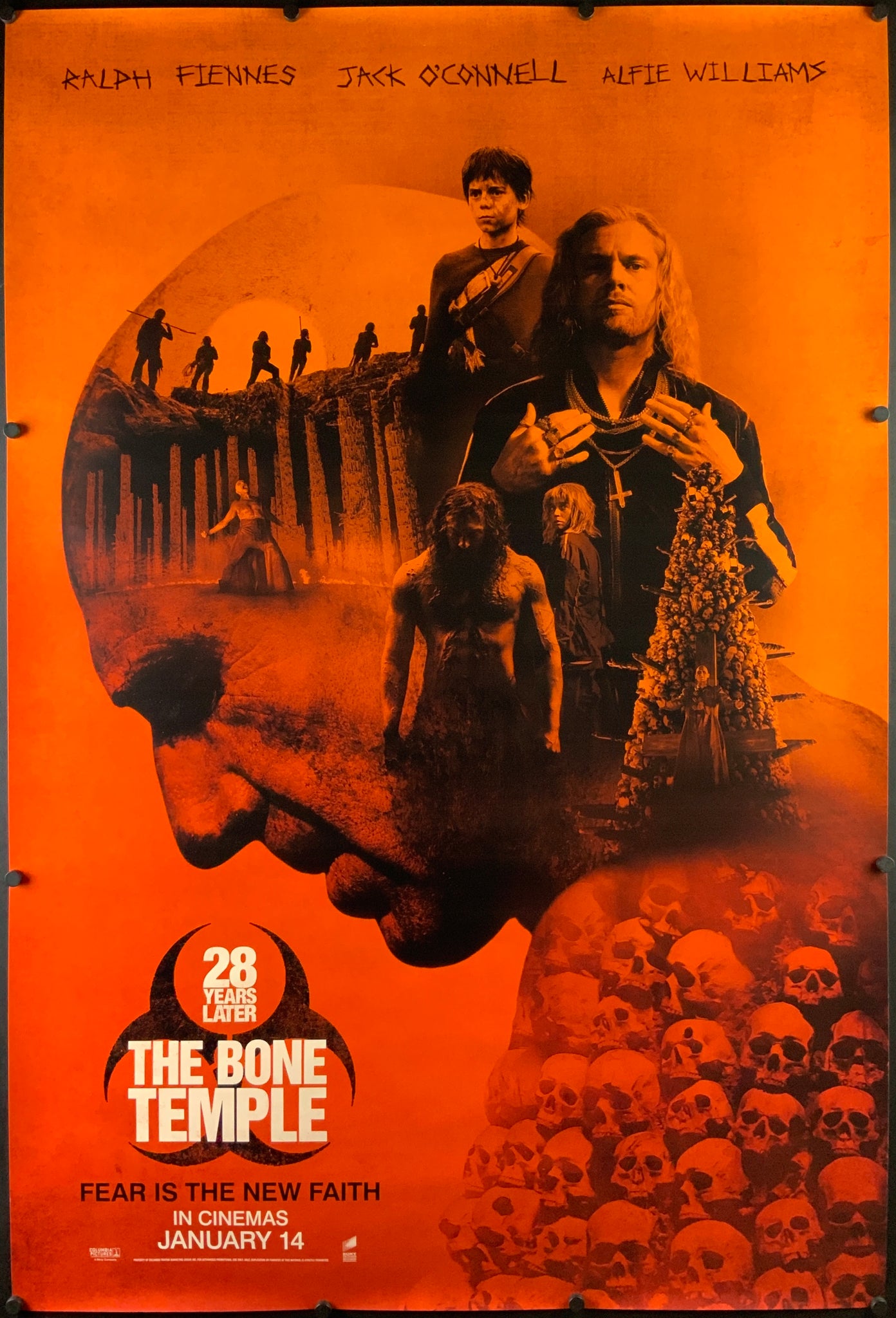 A guaranteed original one sheet movie poster from 2026 for Nia DaCosta and Alex Garland's zombie apocalypse sequel "28 Years Later : The Bone Temple", starring Ralph Fiennes, Jack O'Connell, Alfie Williams, Erin Kellyman and Chi Lewis-Parry.