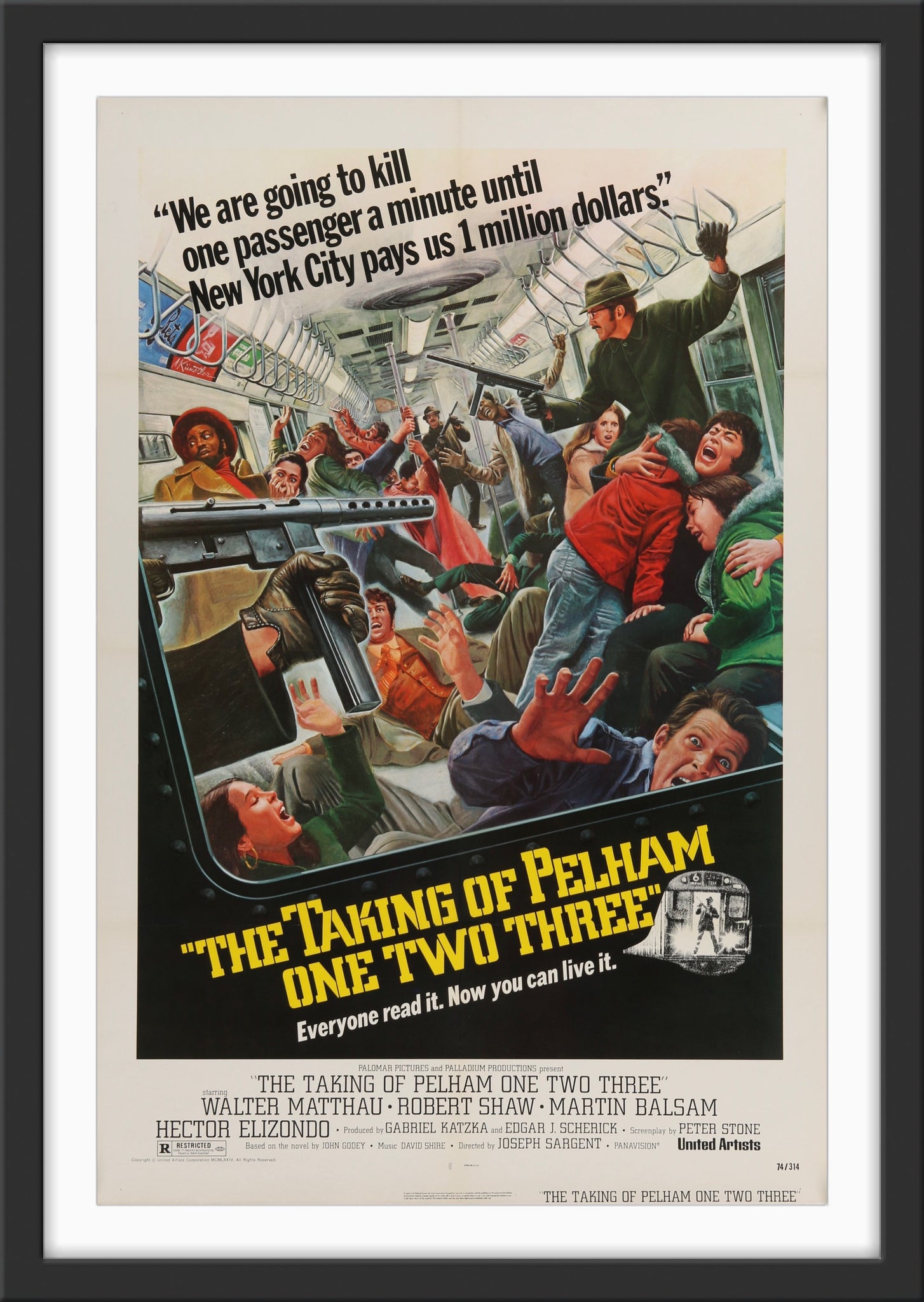 A guaranteed original one sheet movie poster from 1974 for Joseph Sargent's classic subway hostage thriller "The Taking of Pelham One Two Three", starring Walter Matthau, Robert Shaw, Martin Balsam, Hector Elizondo, Earl Hindman, Jerry Stiller and Dick O'Neill.