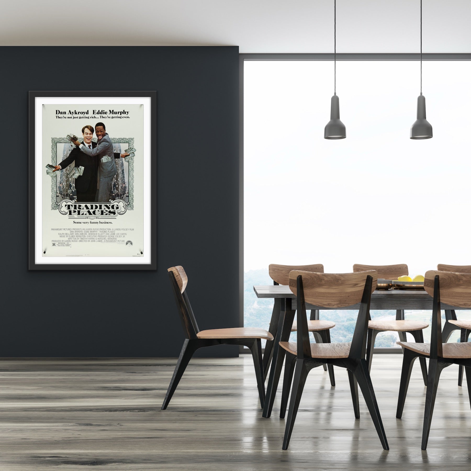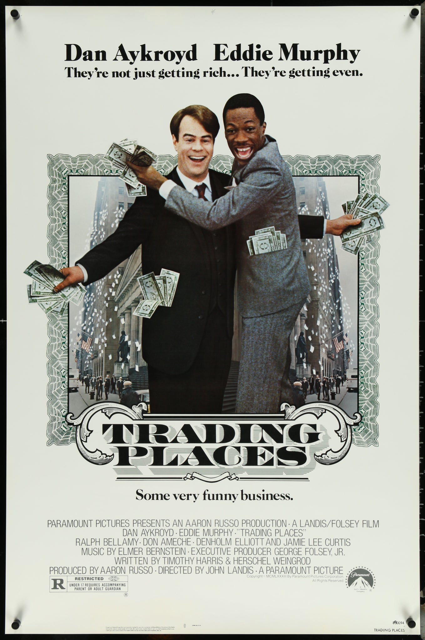 A guaranteed original U.S. one sheet movie poster from 1983 for John Landis' revenge comedy "Trading Places", starring Dan Aykroyd, Eddie Murphy, Ralph Bellamy, Don Ameche, Denholm Elliott, Jamie Lee Curtis and Frank Oz.