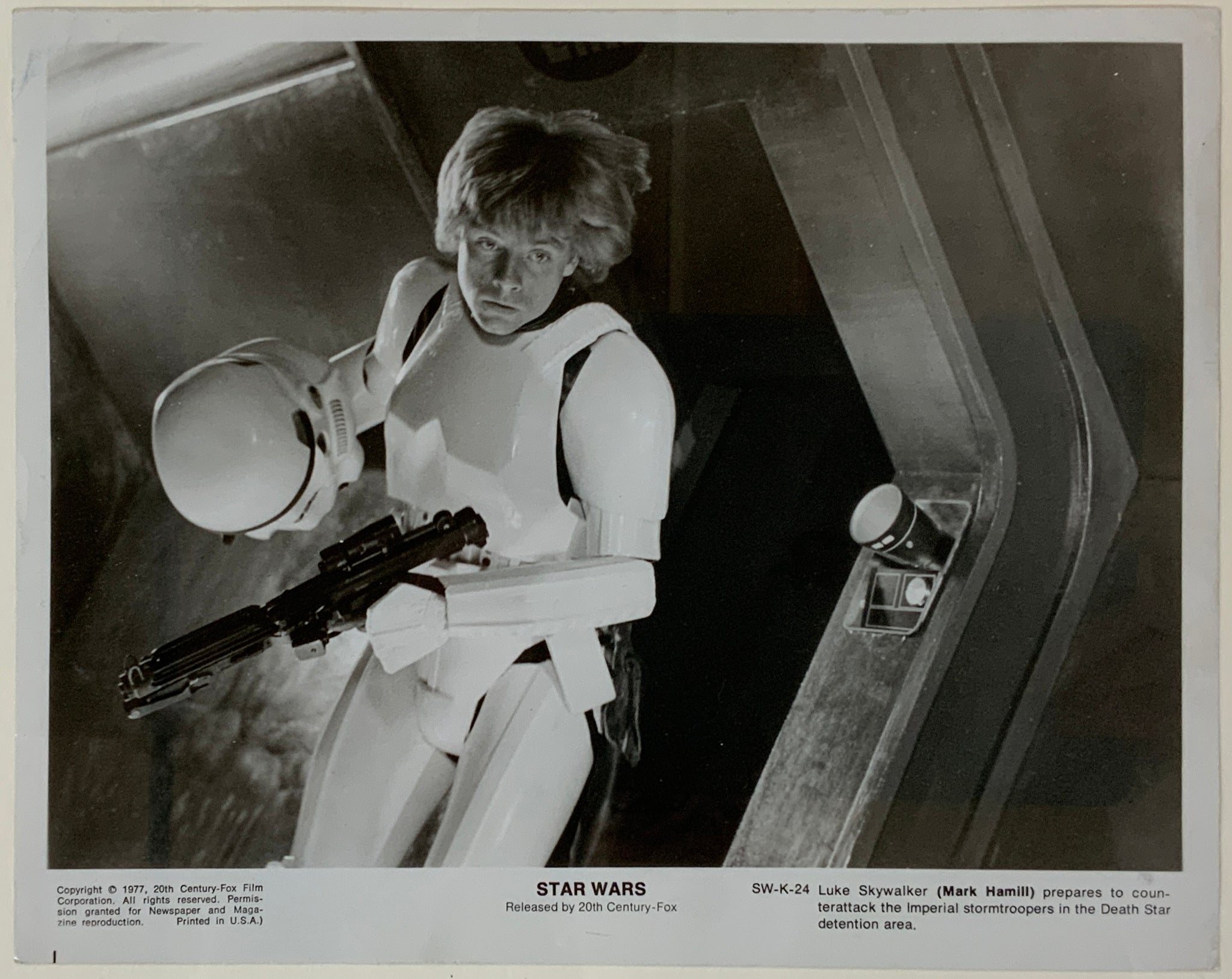 This superb movie still shows Luke dressed as a stormtrooper in the Death Star detention block. Can they rescue the princess and return her to the Rebel Alliance? It would have been taken by a Unit Still Photographer during production and then used for promotion during the film's release.