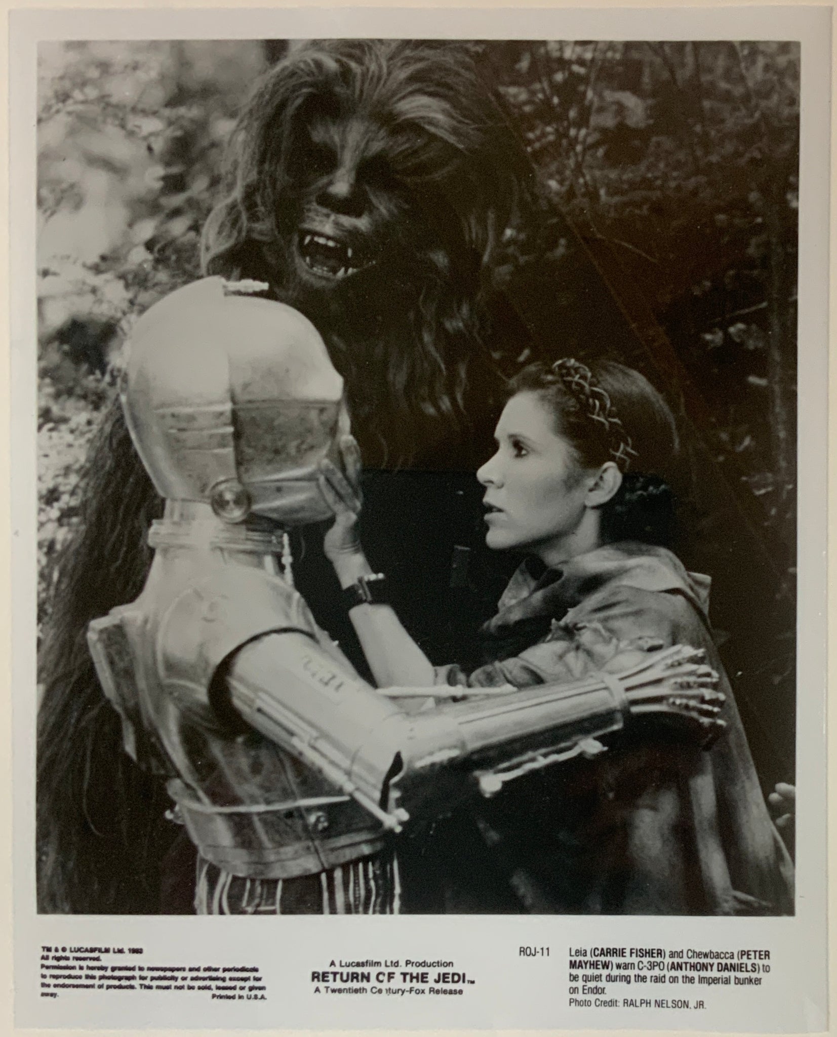 This original movie still by Unit Still Photographer Ralph Nelson Jr., shows Leia, Chewbacca and C-3PO on the Forest Moon of Endor. Can the rebels possibly take down the shield generator protecting the Death Star?