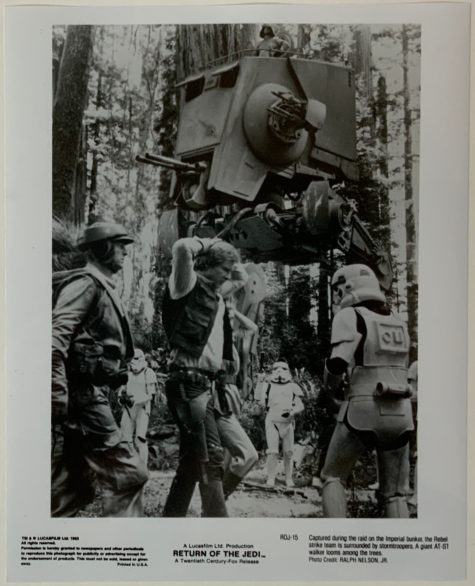 This wonderful movie still by Unit Still Photographer Ralph Nelson Jr, captures the point where the rebel infiltration of the Forest Moon of Endor appears to have failed. Our heroes are rounded up and an All Terrain Scout Transport stands guard. Is that it for the rebellion?