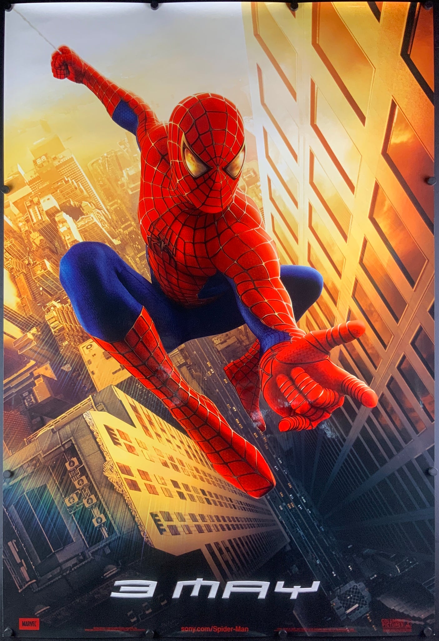 A guaranteed original one sheet teaser movie poster from 2002 for Sam Raimi's super hero adventure "Spider-Man", based on the Marvel comics created by Stan Lee and Steve Ditko.