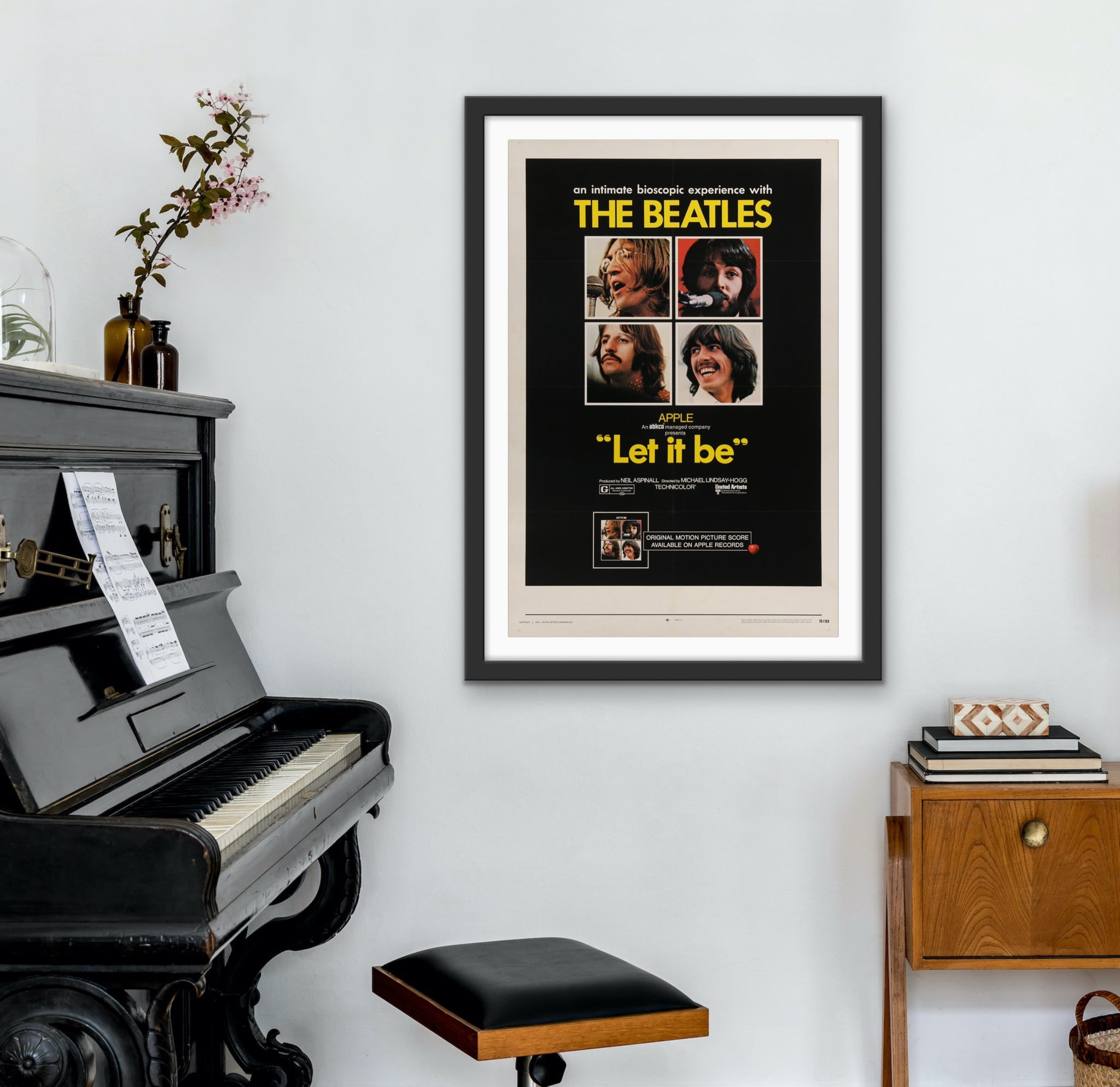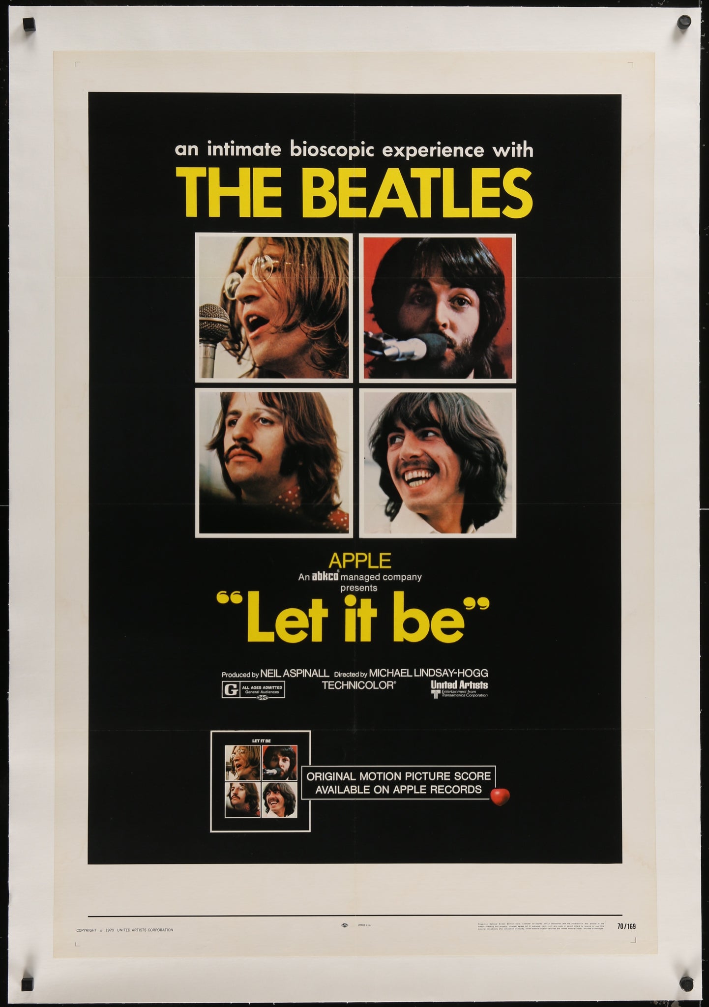 A guaranteed original U.S. one sheet movie poster for Michael Lindsay-Hogg's 1970 album making documentary "Let It Be", featuring the fab four, John Lennon, Paul McCartney, George Harrison and Ringo Starr.